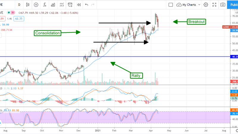 Shares of Lovesac moved higher in the pre-market action but have fallen since the open. The price action is surprising given the strength of the results but is setting up a buying opportunity in our view. Support is evident at the short-term moving average that is consistent with a previous zone of resistance. If confirmed as support, the moving average should continue lifting prices up to new highs above $70 before moving up to and past the $80 level.