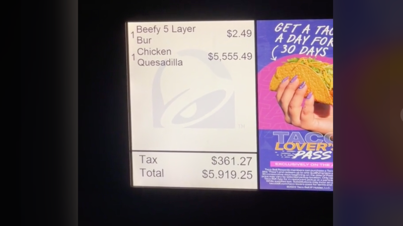 Kenzie Rae (@kenzieraephoto) took to TikTok to share a receipt from a Taco Bell drive-thru that showed a Beefy Five-Layer Burrito that rang up for a normal $2.49 and a chicken quesadilla that was somehow priced at a casual $5,555.49.