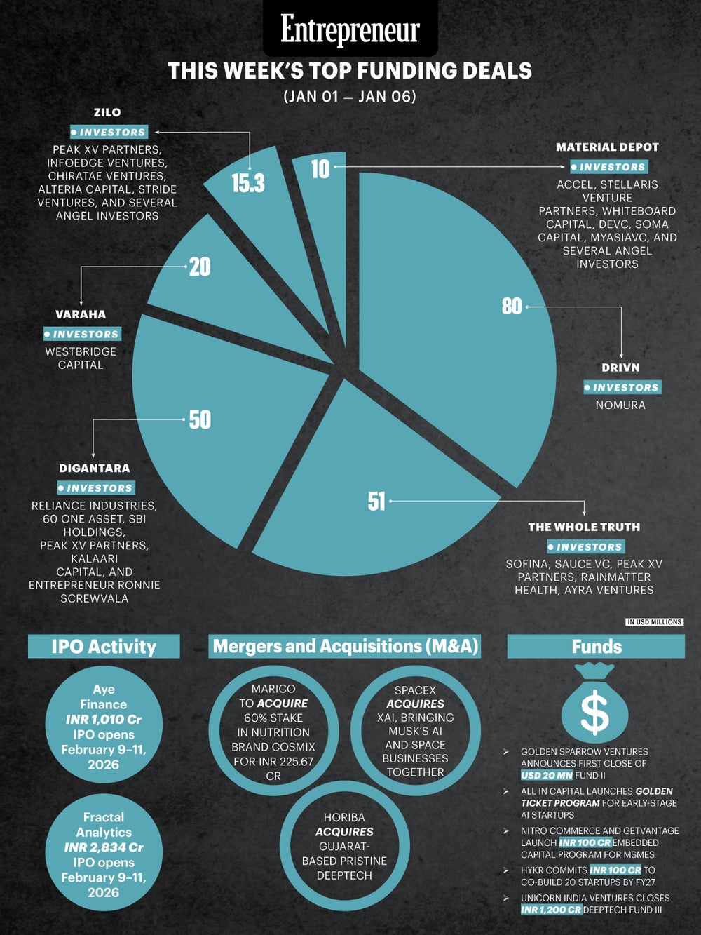 This Week's Top Funding Deals: Big Bets on Mobility, Food, Space and Commerce (Feb 1–Feb 6) The week's top-funded startups included Drivn, The Whole Truth, Digantara, Varaha, ZILO, and Material Depot, spanning mobility, food, spacetech, climate, quick commerce, and home interiors.