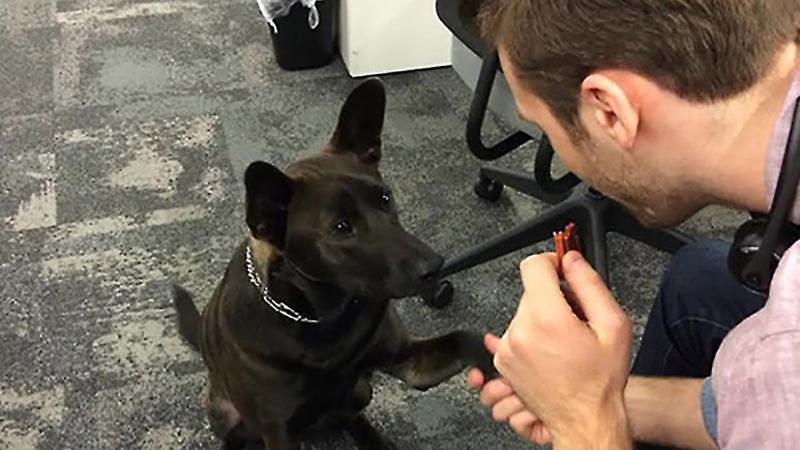 Plus there’s a long, wide aisle for playing catch with Gunner, the office dog. Gunner is a 1-and-½-year-old German shepherd-black Labrador mix who was rescued from a kill shelter in Missouri. Employee Tanveer Hira discovered Gunner two springs ago and fell in love. He was worried about adopting a puppy who would remain at home all day. So I suggested he bring Gunner to the office and this has greatly improved the office’s morale. Playing fetch has become a favorite break activity.