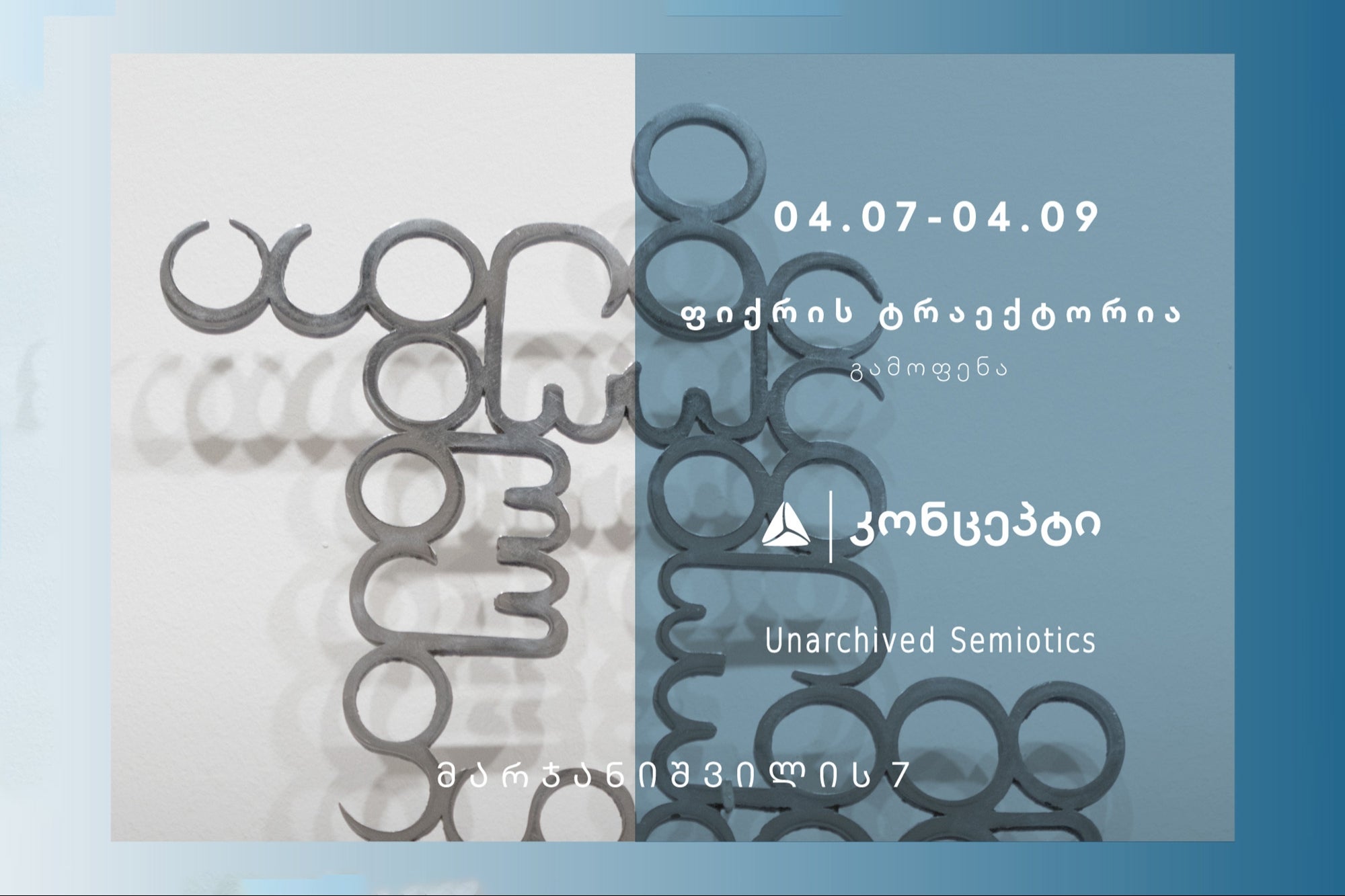 რა არის ხელოვნების სემიოტიკა (ნიშანთა სისტემის შემსწავლელი დისციპლინა)? ჩვენს რეალობაში არსებული სოციალური და ეგზისტენციალური თემატიკის ირგვლივ გამოფენის ვიზუალური ენა და დრამატურგია განიხილავს სივრცით-დროით კავშირებს. შემოქმედებითი ფიქრის განსხვავებული ვიზუალური ფორმირებით განვრცობილი გარემო და გარემოებები - დროში მოხელთებულ ანარეკლებში, ანაბეჭდებში, დატოვებულ ან უეცრად გაელვებულ გამოსახულებებში ვლინდება. სივრცული დიალოგის მეშვეობით გამოფენის კონცეფცია ხელოვნების ვიზუალურ ენას ფილოსოფიური და ანთროპოლოგიური ასპექტებით განავრცობს.