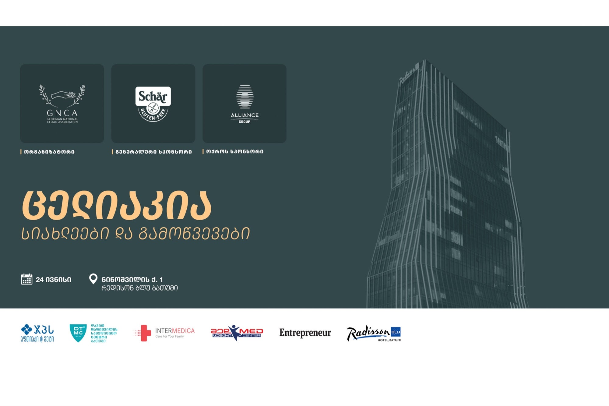 ,,საქართველოს ცელიაკიის ასოციაციის" (,,სცეა") ორგანიზებით, 24 ივნისს, 11:00 საათზე, ბათუმში, სასტუმროში Radisson Blu Batumi გაიხსნება კონფერენცია ,,ცელიაკია: სიახლეები და გამოწვევები." აღნიშნულ ღონისძიებაზე სპიკერებად იქნებიან მოწვეული ექიმები თბილისიდან: ქალბატონი მარიამ ღუღუნიშვილი, ბავშვთა გასტროენტერლოგი და ქალბატონი ნაზი ტაბატაძე, პედიატრი. კონფერენციას გახსნის ,,სცეას" პრეზიდენტი, ქეთი ტაბატაძე. ღონისძიების ფარგლებში პრეზენტაციას წარადგენენ ადგილობრივი ექიმებიც, რომლებიც ისაუბრებენ აჭარის რეგიონში არსებულ მდგომარეობაზე.