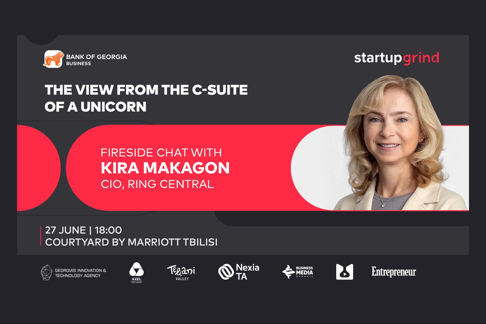 სწორედ ამ მიზნით, საქართველოს ბანკის მხარდაჭერით და სტარტაპ გრაინდის ინიციატივით, 27 ივნისს 18:00 საათზე "ქორთიარდ მარიოტში" გაიმართება შეხვედრა კირა მაკაგონთან, კომპანია RingCentral Ventures-ის ინოვაციების მიმართულების ხელმძღვანელთან. შეხვედრაზე დასასწრებად, გაიარეთ რეგისტრაცია ბმულზე.