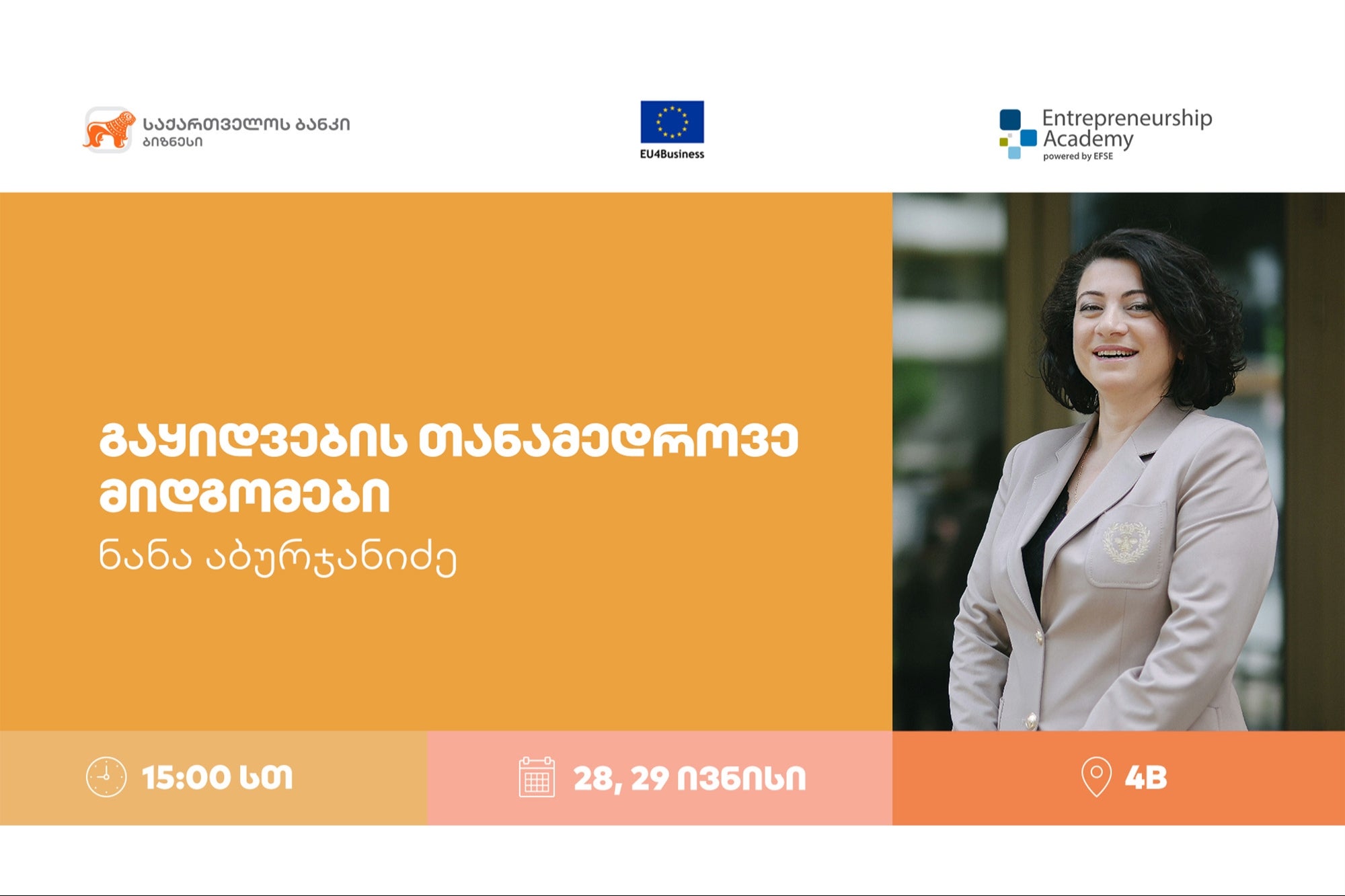საქართველოს ბანკი ბიზნესის ხელშეწყობას განაგრძობს, განსაკუთრებით კი ქალი მეწარმეების მხარდაჭერას. ამ მიზნით 28-29 ბანკისა და EFSE Entrepreneurship Academy-ს პარტნიორობის ფარგლებში გაყიდვების სფეროს თანამედროვე მიდგომებთან დაკავშირებით ვორკშოპი გაიმართება. შეხვედრა საქართველოს ბანკის 4B-ს სივრცეში ჩატარდება და მას კომპანია "სოლუშენერის" დამფუძნებელი, ნანა აბურჯანიძე გაუძღვება.