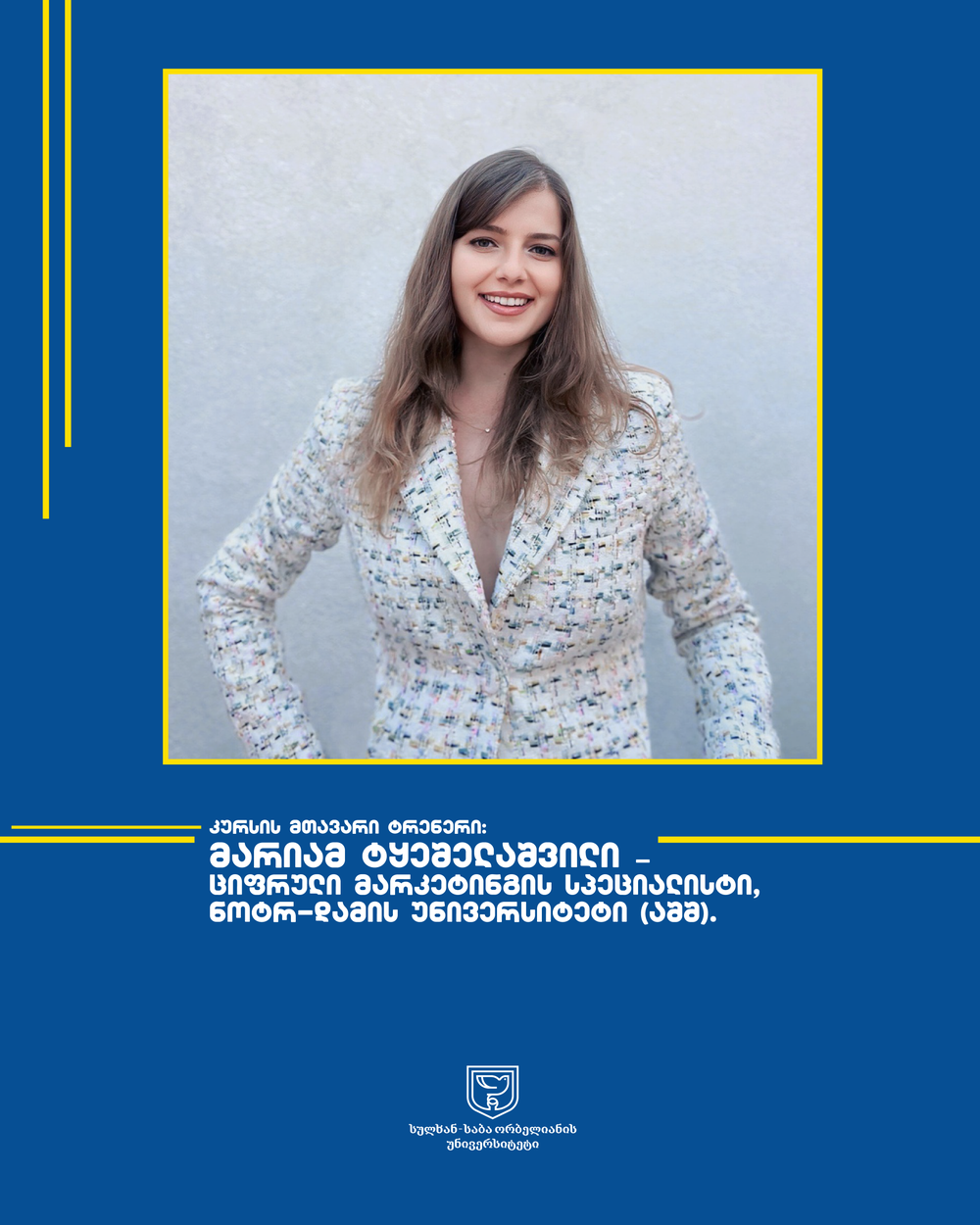 კურსს ამერიკის ერთ-ერთი წამყვანი უნივერსიტეტის - University of Notre Dame-ის ციფრული მარკეტინგის სპეციალისტი - მარიამ ტყეშელაშვილი გაუძღვება. კურსის ფარგლებში დაგეგმილ პრაქტიკულ მასტერკლასებს კი, Meta-ს მომხმარებელთან ურთიერთობის მენეჯერი გამართავს.