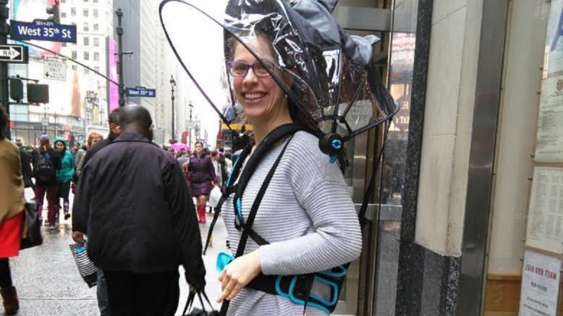 Nubrella is a covering for the rain that you wear like a backpack. Turning dials on the sides (near your shoulders) unfolds a plastic hood over your head to keep you dry while your hands remain blissfully unencumbered. The railing-using, grocery-carrying, phone-answering multitasker in me was thrilled before I even tried it on. Sure, I’d look weird, but I figured people wouldn’t notice it too much. When you live in a city with a Naked Cowboy and a man who walks through Times Square with a cat on his head — seriously, I’ve seen that guy — a backpack umbrella is relatively inconspicuous.