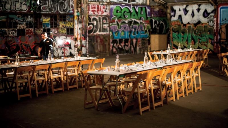 Events are held in nontraditional venues, from the floor of a motorcycle factory to an airplane hangar, and each begins with the chef explaining the theme of the meal and the origin of the recipes and ingredients. Many are local sous chefs and line cooks who have never had the opportunity to present their own creations to the public; others are popular Dinner Lab cooks who make small regional or national tours. Meals have been as varied as Venezuelan comfort food based on family recipes to creations of cutting-edge molecular gastronomy.