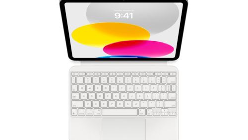 The new iPad keyboard has a function row and larger trackpad "so the entire experience feels just like using a MacBook," said John Ternus, Apple senior vice president of hardware engineering, at Apple's first event of 2024.