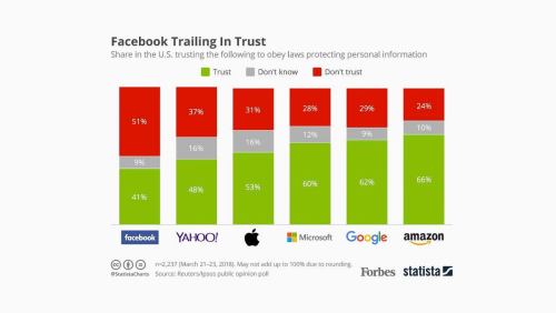 Business News This Big Tech Company Is the Most Trusted, According to New Survey According to data from Forbes and Statista, 51 percent of consumers do not trust Facebook to obey laws protecting personal information. By PCMag Staff
